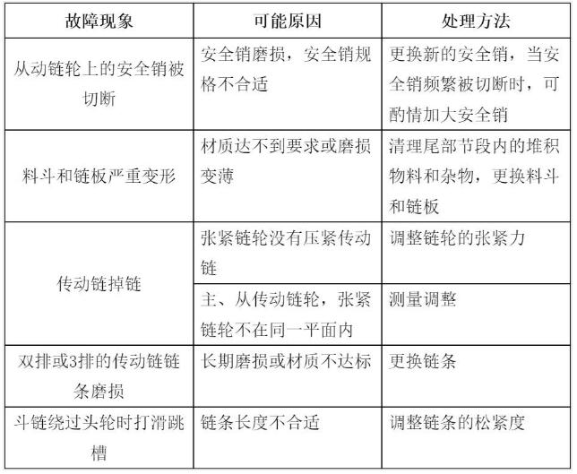 當(dāng)斗鏈過松造成料斗刮底或鏈條繞過頭輪兩側(cè)間距不一致時,應(yīng)通過拉緊裝置進(jìn)行不定期調(diào)整;